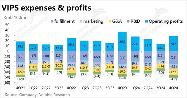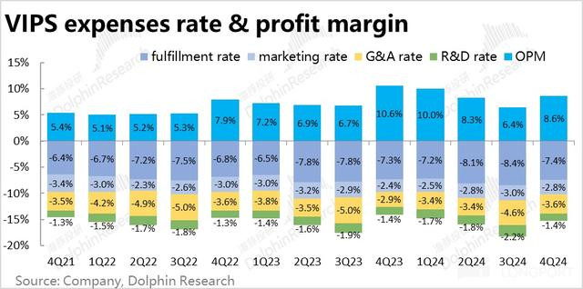 4、费用端,唯品会本季总经营支出为 50.7 亿,同比增长了 4%,也高于预期的 49 亿支出。在营收和毛利润仍同比收缩的情况下,本季的经营费用却是同比正增且高于预期,显然在控制费用角度表现不算好。