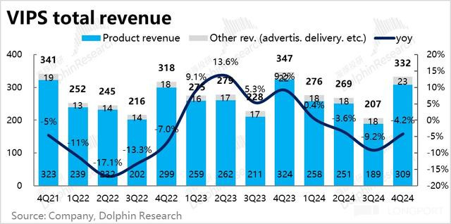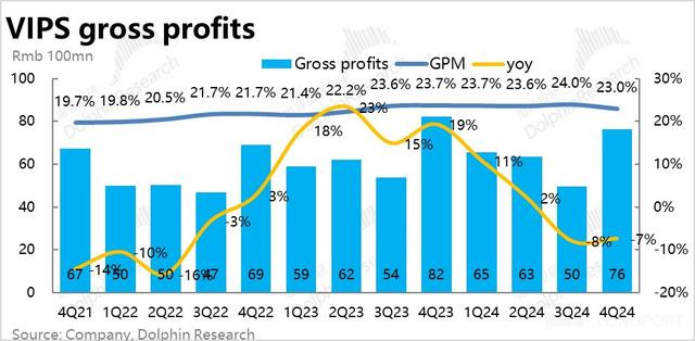 2、由于 GMV 超预期的表现,本季唯品会的总营收虽仍同比下降了 4.2%,但显著好于市场预期的-8%。分收入类型,商品销售收入同比负增 5%,明显好于上季-10% 的表现。广告、物流等附加服务收入同比增长了 4%,则较上季大体持平。