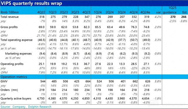 北京时间 11 月 19 日美股盘前,$唯品会.US 发榜了 2024 年 4 季度财报,概括来看由于大超预期的 GMV 指标,唯品会本季各主要财务指标普遍好于预期,且慷慨的股东回报都是亮点,具体来看: